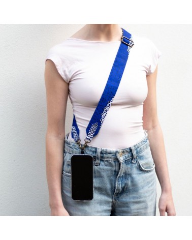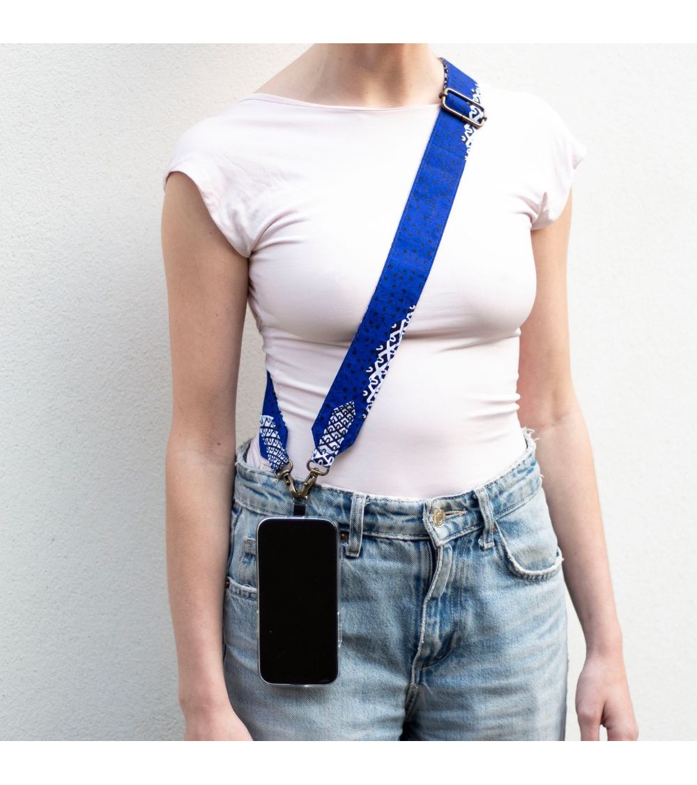 La bandoulière en Wax bleue est fabriquée main en France avec du tissu Wax en coton bleu. La bandoulière est fabriquée la main avec le plus grand soin. La bandoulière sera votre alliée en soirée et en sortie votre smartphone sera en sécurité. La bandoulière peut s'attacher aussi bien sur votre coque téléphone ou sac à main.